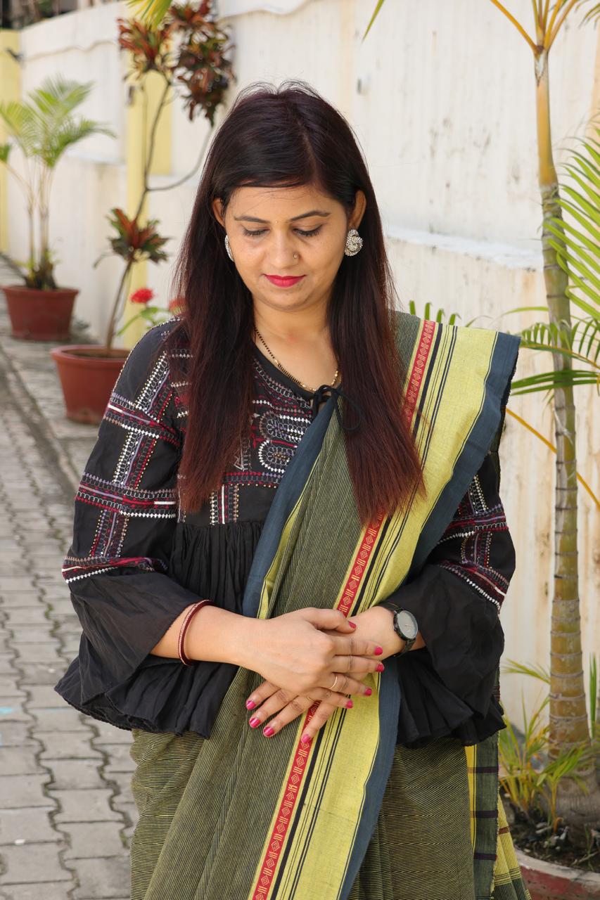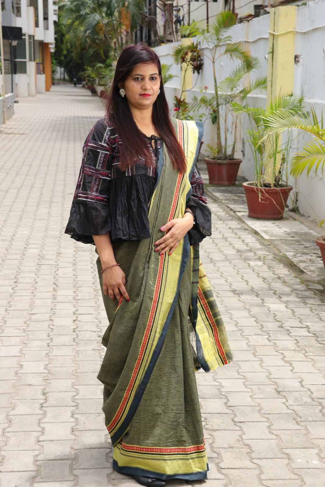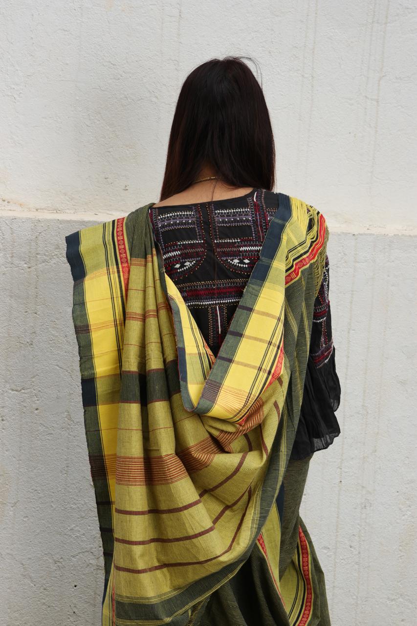 Aane hejje saree also known as anekal sarees. This is a cotton saree which was in vogue 60 years ago, predominantly woven and worn in and around anekal (rural district of Bangalore). The specialty of the saree is the border, where a segment resembles an elephant head (diamond) and it’s foot prints (the vertical lines in either side or the diamond). Hence the name Aane hejje or Aane kal which over time became Anekal. Elephant in Kannada in Aane. The horizontal stripes on the saree denotes the unity or togetherness among the people. Yellow border Anne Hejje reversible ready to wear saree with two pallus.Length 5.70 meters and width 45 inches with two distinctive pallus can be worn on both the sides no need of fall and beading. Incase you want to make a blouse one of the pallus can be used (since the legnth of saree is made accordingly). Dyed with ecofriendly dyes no need of ironing or starching wash (hand wash) and wear saree (Zero Maintenance). Delivery: Ready to ship. ** EVERY SAREE COMES WITH TWO UNIQUE PALLUS NO TWO SAREES ARE SAME PALLU